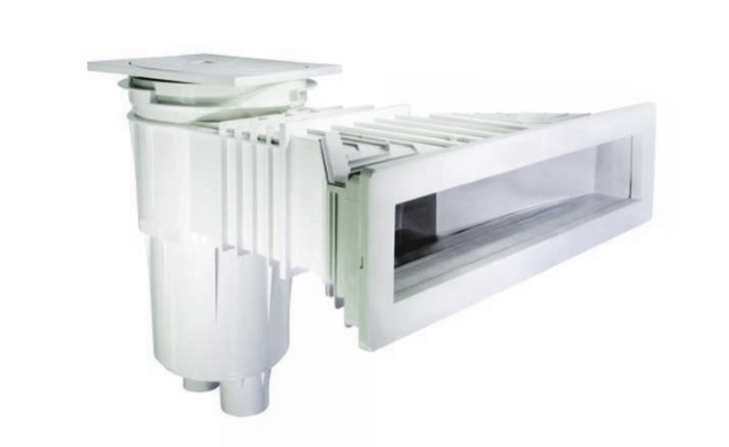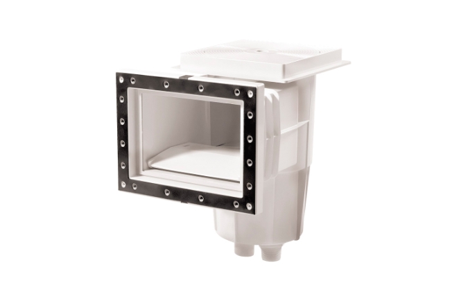 Le skimmer ramasse les saletés à la surface avant qu'elles ne tombent au fond, empêchant ainsi la formation d'algues et de microbes dans la piscine. Le skimmer aspire l'eau de la piscine dans l'unité de filtration, qui s'écoule ensuite dans une cuve en plastique, généralement située 5 à 10 cm en dessous du fond de la piscine. À l'intérieur de cette entrée en plastique se trouve un préfiltre grossier (panier) qui retient les plus grosses impuretés mécaniques. Cette eau prétraitée est pompée par une pompe vers le système de filtration, où elle est renvoyée dans la piscine par des buses de retour. La forme d'une piscine détermine l'emplacement des buses de refoulement. En général, les buses doivent ramener l'eau à 20-30 cm sous la surface de l'eau afin que l'eau circule uniformément dans la piscine.